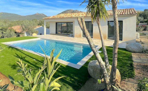 Sise sur 692m2 de terrain arboré, paysagé, enroché et clos; Magnifique BERGERIE T-4 NEUVE (livrée en Juin 2024) de 138m2 hab. alliant parfaitement le traditionnel au contemporain. TRÈS BELLES PRESTATIONS dont: .Climatisation réversible dans toutes les pièces. .Menuiseries aluminium avec volets roulants télécommandés à distance. .Cuisine équipée, Lave linge, Sèche linge. .Portail électrique, digicode, alarme. .Borne de recharge. .Fibre. .Terrasse en ipé avec PISCINE 8x4 équipée d'une pompe à chaleur (chaud/froid). .VUE PANORAMIQUE MER, aucun vis-à-vis. .Jardin paysagé et conçu pour un entretien facile, arrosage automatique. VENDUE ENTIÈREMENT MEUBLÉE ET ÉQUIPÉE tant intérieur qu'extérieur (avec même ameublement et prestations que pour du prêt-à-louer). Prix: 1.015.000€. FRAIS DE NOTAIRE RÉDUITS. Dominant les plages de Santa Giulia et Palombaggia: BERGERIE RÉNOVÉE VUE MER entièrement meublée et équipée avec TERRASSE/PERGOLA et PISCINE, DOUBLE CARPORT.