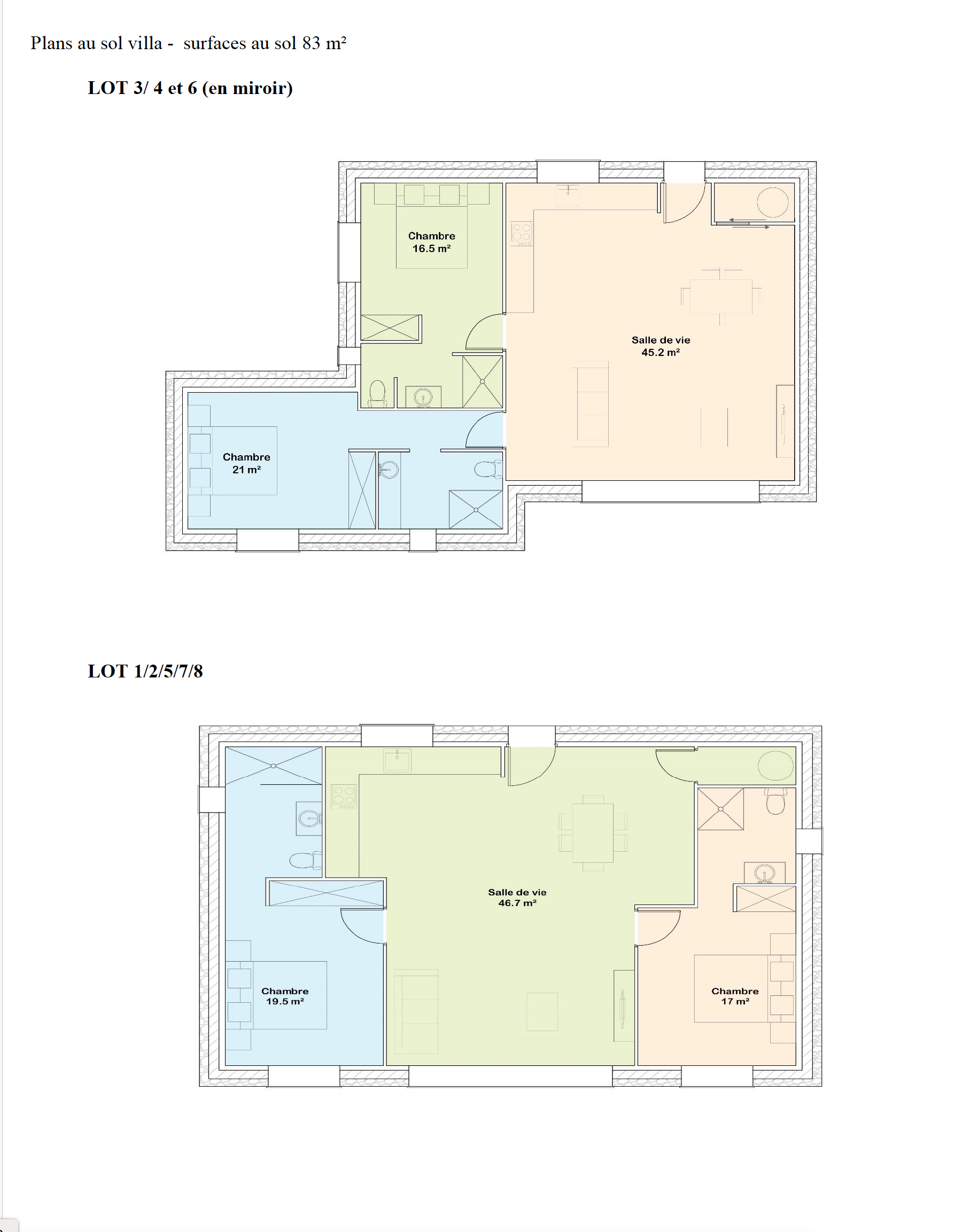 .2 belles chambres équipées chacune d'un placard mural de rangement et de sa salle d’eau privative avec w-c de surfaces respectives 21m2 et 16,50m2.
