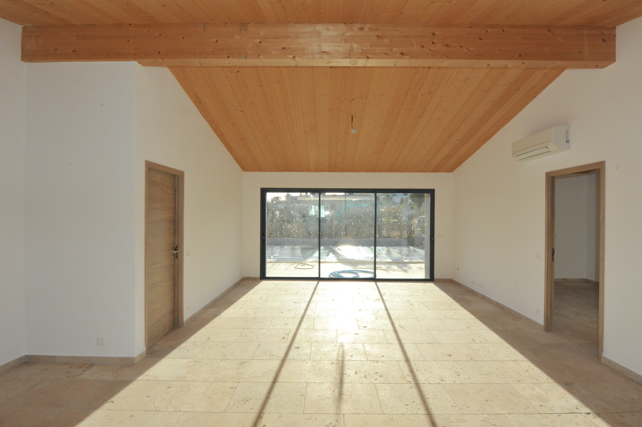 . plafond poutres et planches de bois massif,
