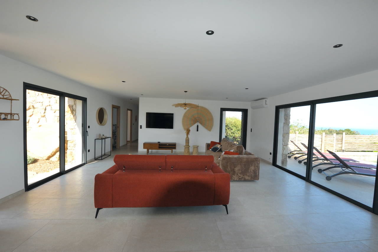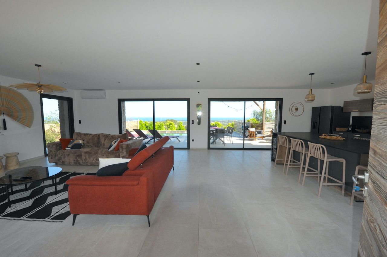 -Une grande pièce à vivre lumineuse donnant sur une terrasse avec piscine chauffée dominant la mer à 180°.