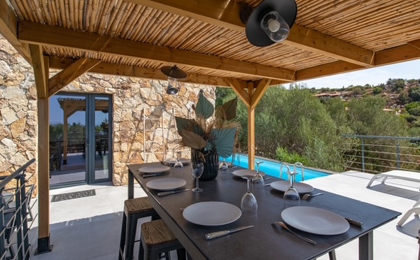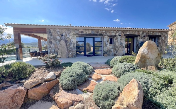Sise sur 692m2 de terrain arboré, paysagé, enroché et clos; Magnifique BERGERIE T-4 NEUVE (livrée en Juin 2024) de 138m2 hab. alliant parfaitement le traditionnel au contemporain. TRÈS BELLES PRESTATIONS dont: .Climatisation réversible dans toutes les pièces. .Menuiseries aluminium avec volets roulants télécommandés à distance. .Cuisine équipée, Lave linge, Sèche linge. .Portail électrique, digicode, alarme. .Borne de recharge. .Fibre. .Terrasse en ipé avec PISCINE 8x4 équipée d'une pompe à chaleur (chaud/froid). .VUE PANORAMIQUE MER, aucun vis-à-vis. .Jardin paysagé et conçu pour un entretien facile, arrosage automatique. VENDUE ENTIÈREMENT MEUBLÉE ET ÉQUIPÉE tant intérieur qu'extérieur (avec même ameublement et prestations que pour du prêt-à-louer). Prix: 1.015.000€. F-N-RÉDUITS. Dominant les plages de Santa Giulia et Palombaggia: BERGERIE RÉNOVÉE VUE MER entièrement meublée et équipée avec TERRASSE/PERGOLA et PISCINE, DOUBLE CARPORT.